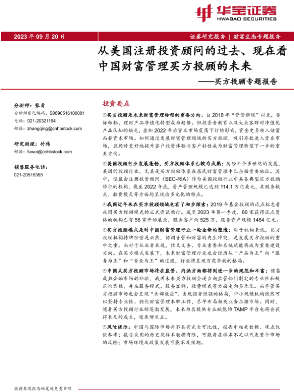 【华宝证券】【20230920】买方投顾专题报告:从美国注册投资顾问的过去、现在看中国财富管理买方投顾的未来-23页 行业研究