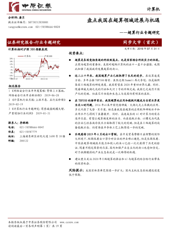 【中原证券】【20190731】盘点我国在超算领域进展与机遇-19页 行业研究