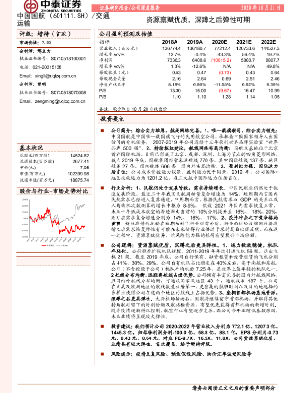 【中泰证券】【20201021】中国国航-资源禀赋优质,深蹲之后弹性可期-28页 行业研究
