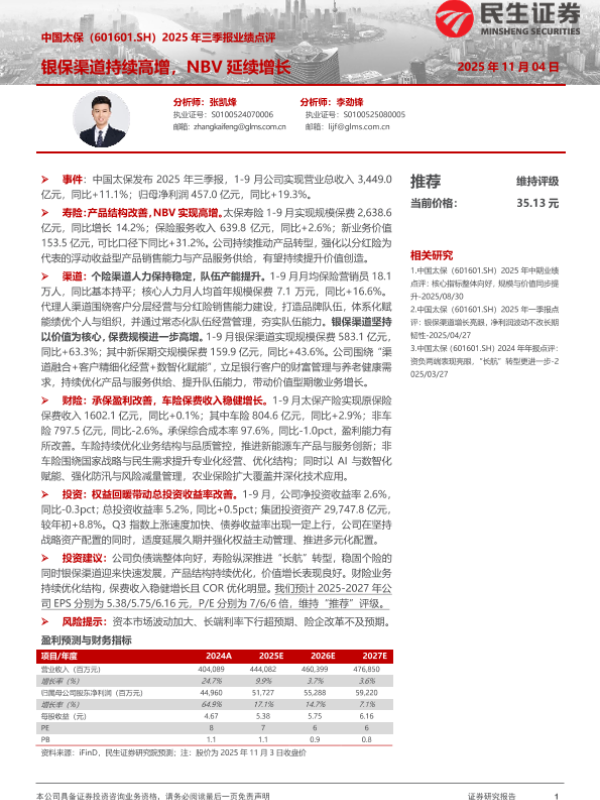 【民生证券】【202511】中国太保(601601.SH)2025年三季报业绩点评:银保渠道持续高增,NBV延续增长-4页 证券期货研究报告