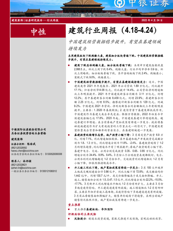 【中银证券】【20220424】建筑行业周报:中国建筑经营数据稳步提升,有望在基建领域持续发力-15页 行业研究