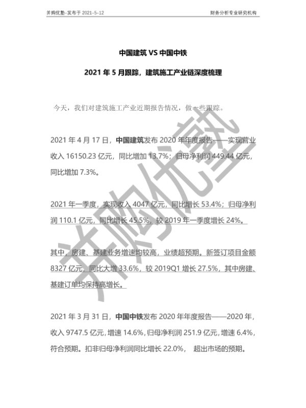 【并购优塾】【20210512】中国建筑VS中国中铁:2021年5月跟踪,建筑施工产业链深度梳理-23页 行业研究