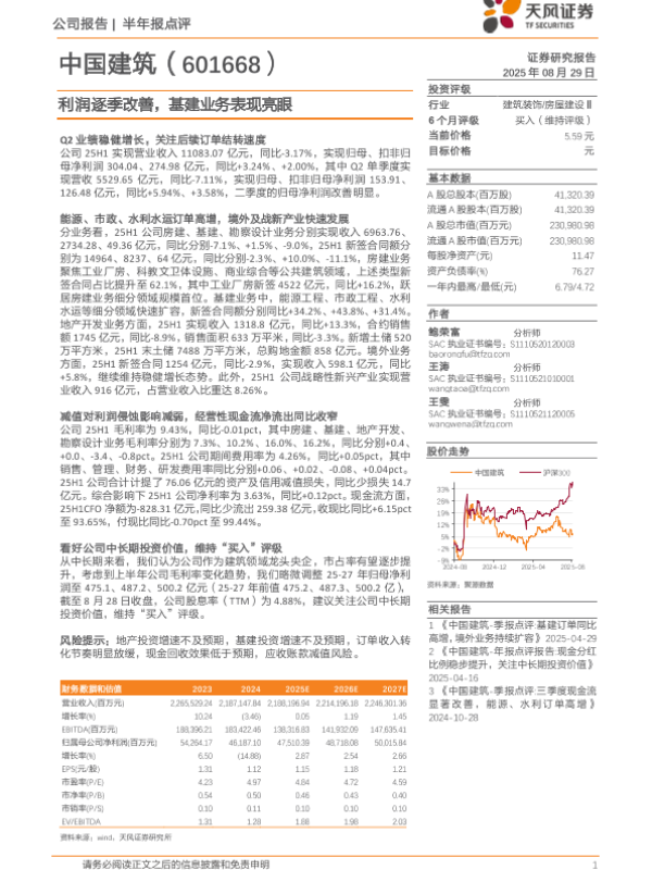 【天风证券】【20250829】中国建筑-利润逐季改善_基建业务表现亮眼-3页 证券期货研究报告