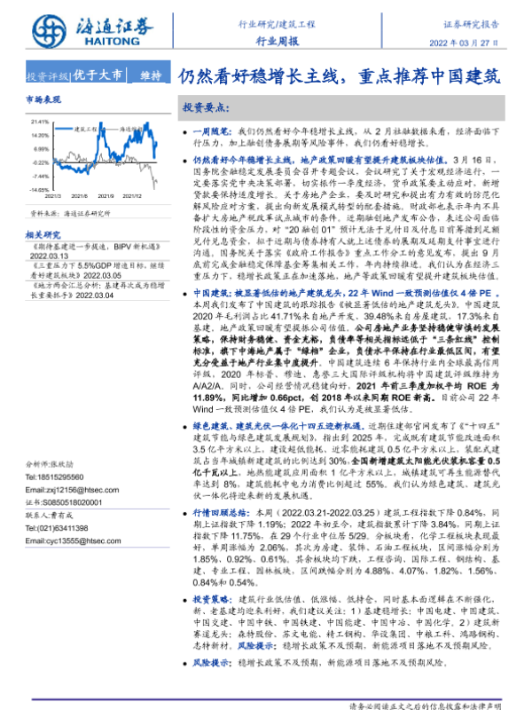 【海通证券】【20220327】建筑工程行业周报:仍然看好稳增长主线,重点推荐中国建筑-6页 行业研究