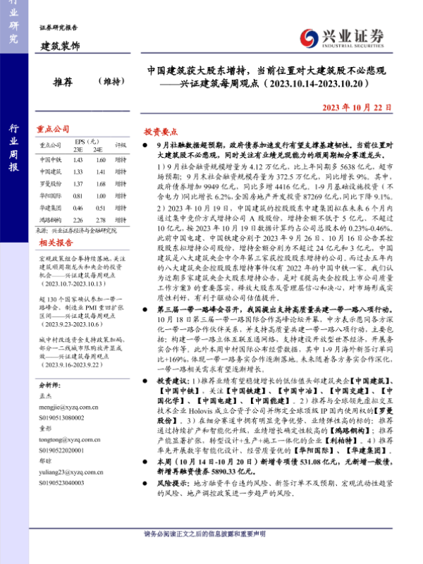 【兴业证券】【20231022】中国建筑获大股东增持,当前位置对大建筑股不必悲观-31页 行业研究