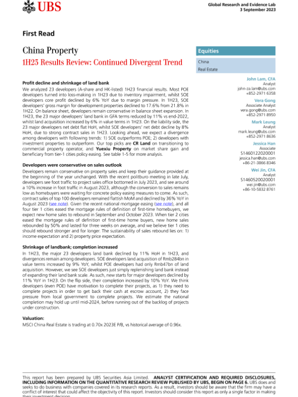 【UBS Securities Asia Limited】【20230903】China Property 1H23 Results Review Continued Divergent Trend-15页 行业研究