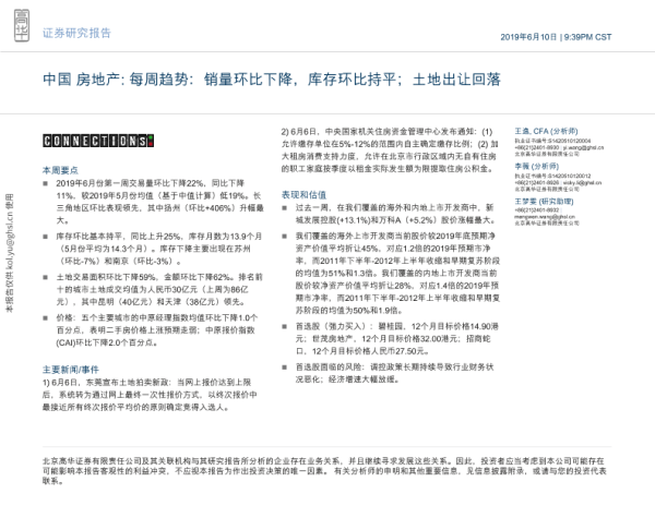 【Goldman Sachs】【20190610】中国房地产:每周趋势:销量环比下降,库存环比持平;土地出让回落-11页 行业研究