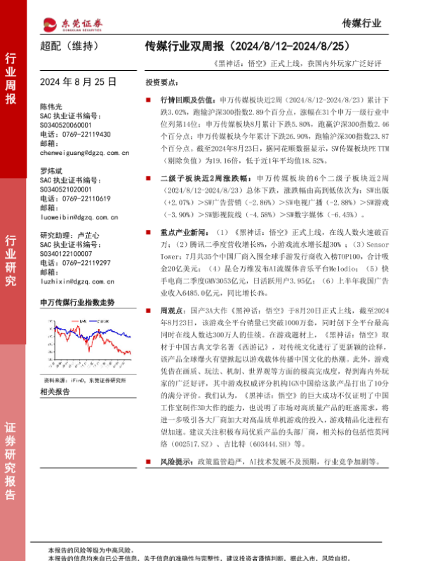 【东莞证券】【20240825】20240825-东莞证券-传媒行业双周报:《黑神话:悟空》正式上线,获国内外玩家广泛好评-12页 行业研究