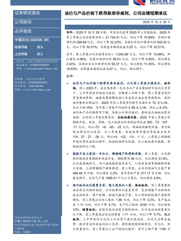 【信达证券】【202510】油价与产品价格下跌导致库存减利,公司业绩短期承压-5页 证券期货研究报告