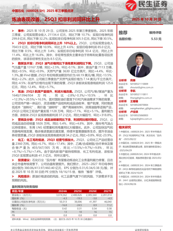 【民生证券】【202510】中国石化(600028.SH)2025年三季报点评-3页 证券期货研究报告