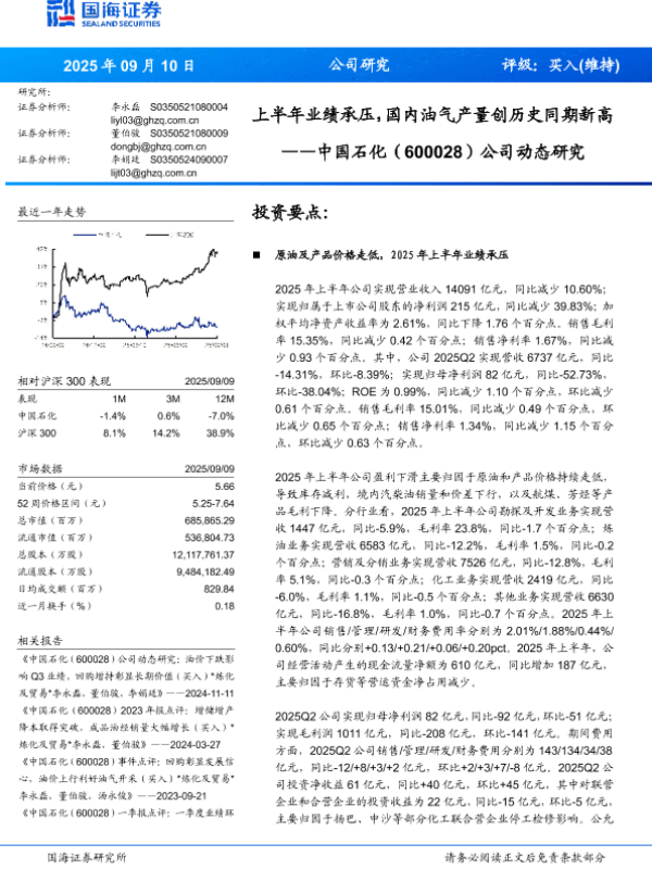 【国海证券】【202509】中国石化(600028)公司动态研究:上半年业绩承压,国内油气产量创历史同期新高-12页 公司研究