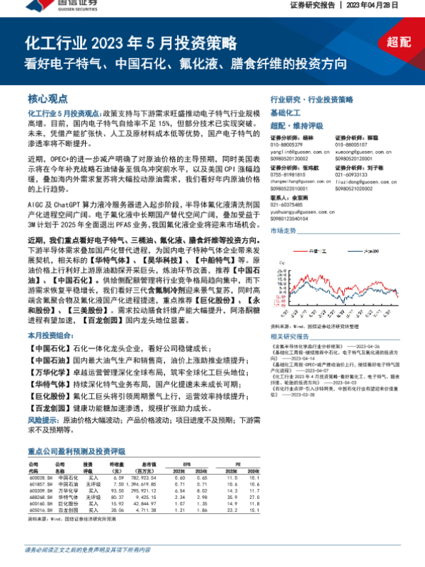 【国信证券】【20230428】2023年5月化工行业投资策略:看好电子特气、中国石化、氟化液、膳食纤维的投资方向-27页 行业研究