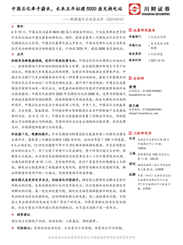 【川财证券】【20210416】新能源行业动态点评:中国石化牵手蔚来,未来五年拟建5000座充换电站-2页 证券期货研究报告