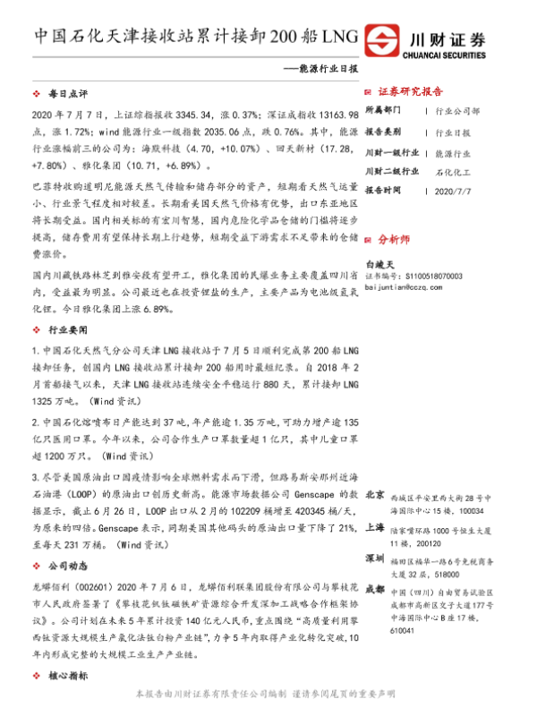 【川财证券】【20200707】能源行业日报:中国石化天津接收站累计接卸200船LNG-3页 证券期货研究报告
