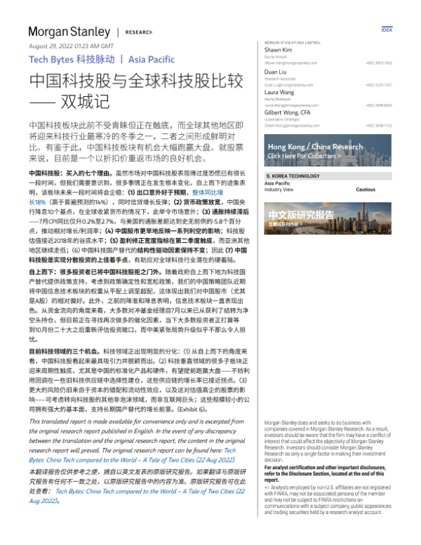 【Morgan Stanley】【20220822】中国科技股与全球科技股比较——双城记-12页 行业研究