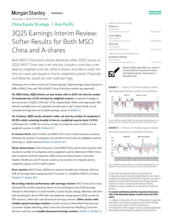 【Morgan Stanley】【2025】China Equity Strategy/1|Asia Pacific 3Q25 Earnings Interim Review Softer Results for Both MSCI China and A-shares-28页 证券期货研究报告