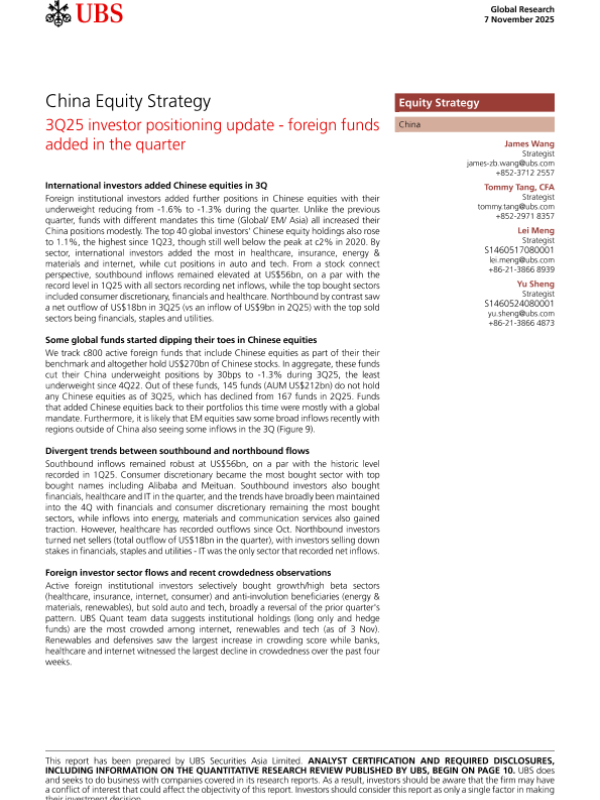 【UBS】【202511】China Equity Strategy3Q25 investor positioning update - foreign funds added in the quarter-14页 证券期货研究报告