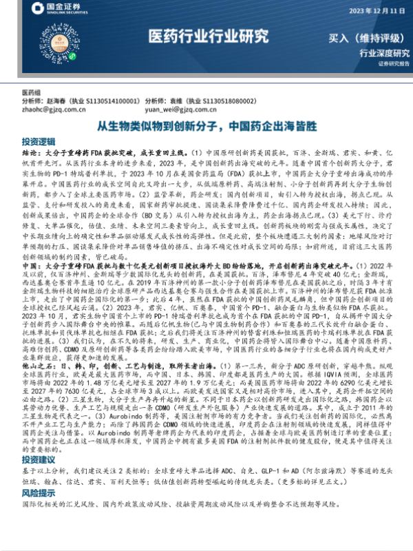 【国金证券】【20231213】医药行业行业研究-从生物类似物到创新分子-中国药企出海皆胜-27页 行业研究