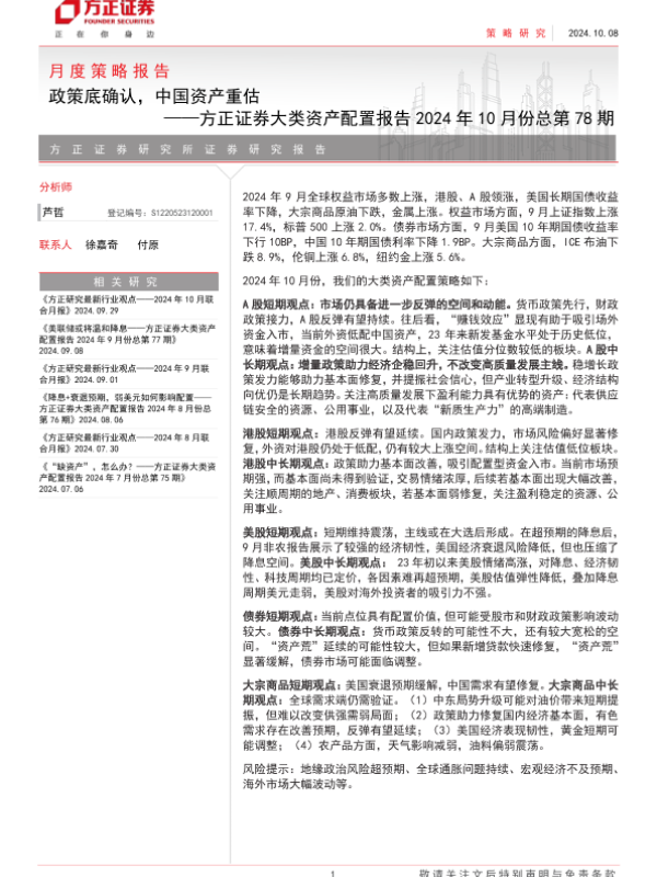 【方正证券】【20241008】大类资产配置报告2024年10月份总第78期:政策底确认,中国资产重估-27页 宏观策略