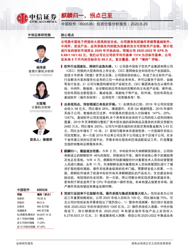 【中信证券】【20200629】20200629-中信证券-中国软件-600536.SH-投资价值分析报告:麒麟归一,拐点已至-38页 行业研究