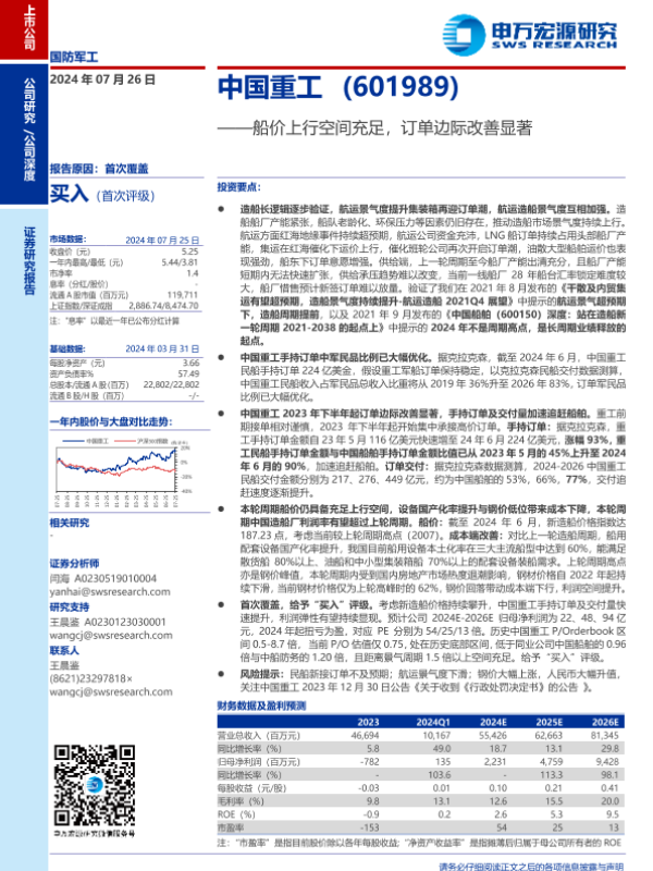 【申万宏源】【20240726】中国重工(601989)船价上行空间充足,订单边际改善显著-43页 行业研究