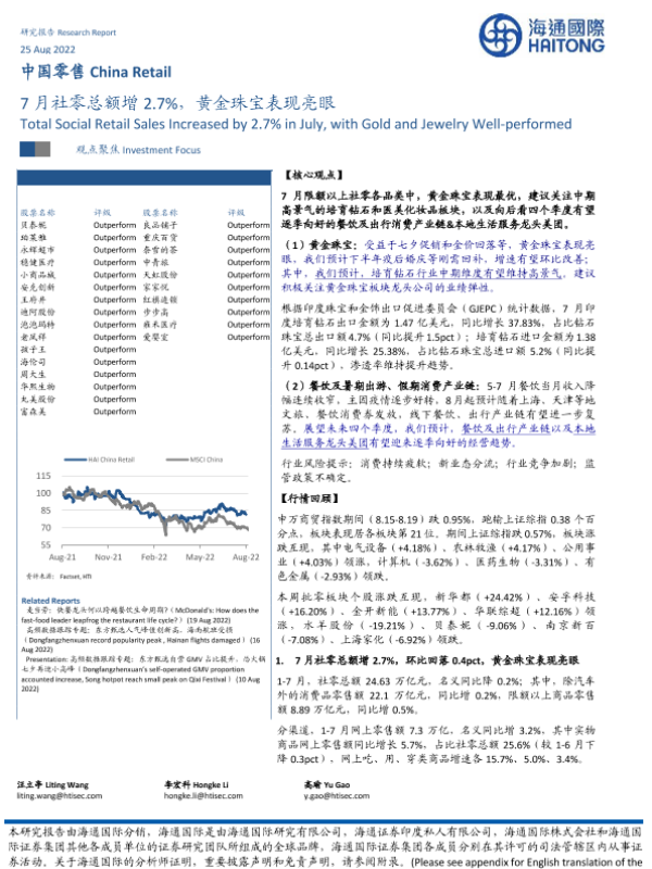 【海通国际】【20220825】7月社零总额增2.7%,黄金珠宝表现亮眼-15页 行业研究