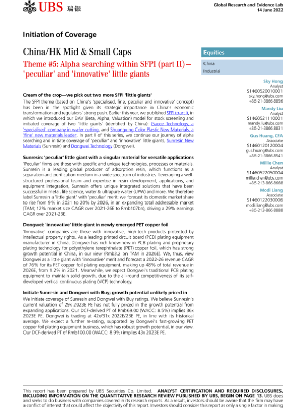 【瑞银】【20220614】中国投资策略-中国香港中小盘股主题五:SFPI内部的Alpha搜索(第二部分)-‘特殊的’和‘创新的’小巨头-21页 行业研究
