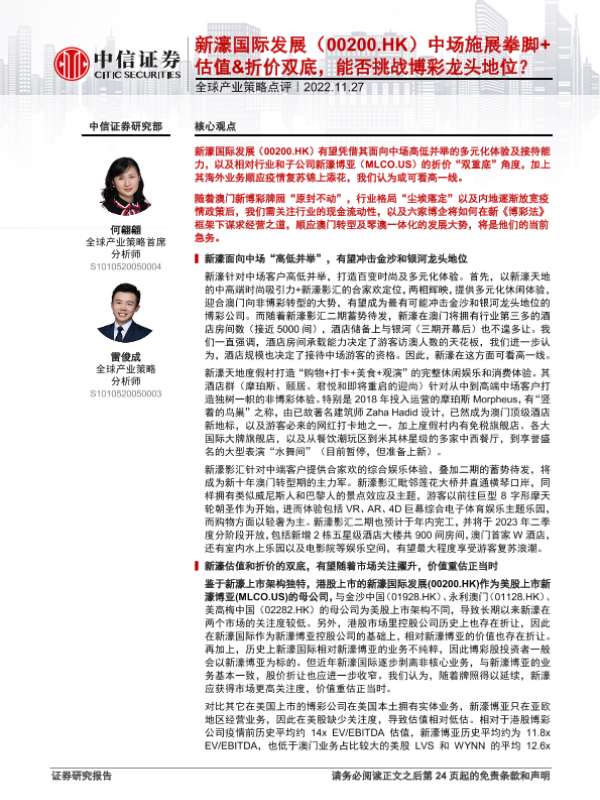 【中信证券】【20221127】全球产业策略点评:新濠国际发展中场施展拳脚+估值&折价双底,能否挑战博彩龙头地位?-25页 行业研究