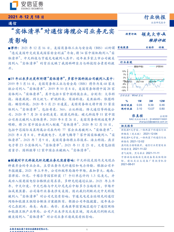 【安信证券】【20211218】“实体清单”对通信海缆公司业务无实质影响-4页 行业研究