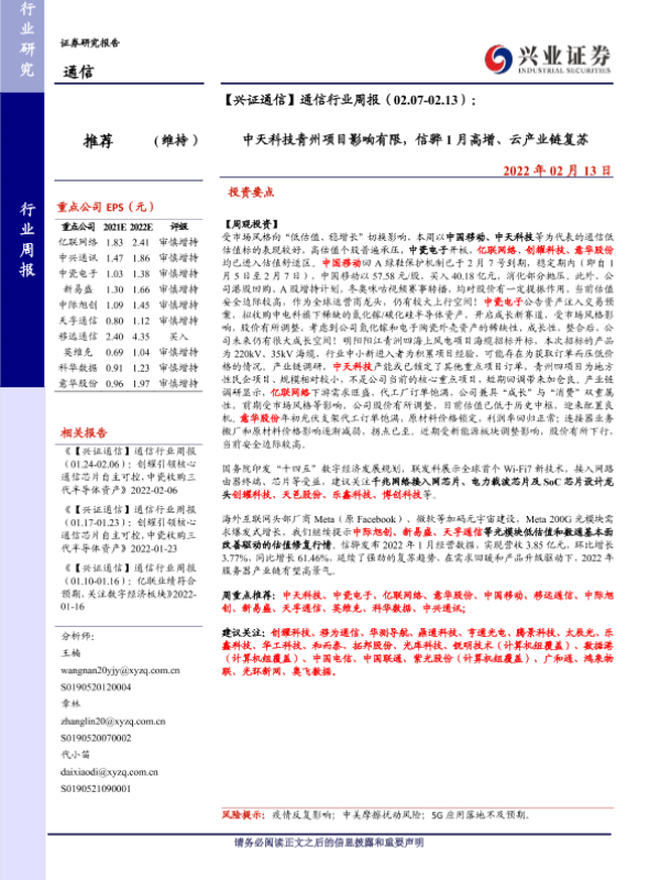 【兴业证券】【20220213】通信行业周报(02.07-02.13):中天科技青州项目影响有限,信骅1月高增、云产业链复苏-28页 行业研究