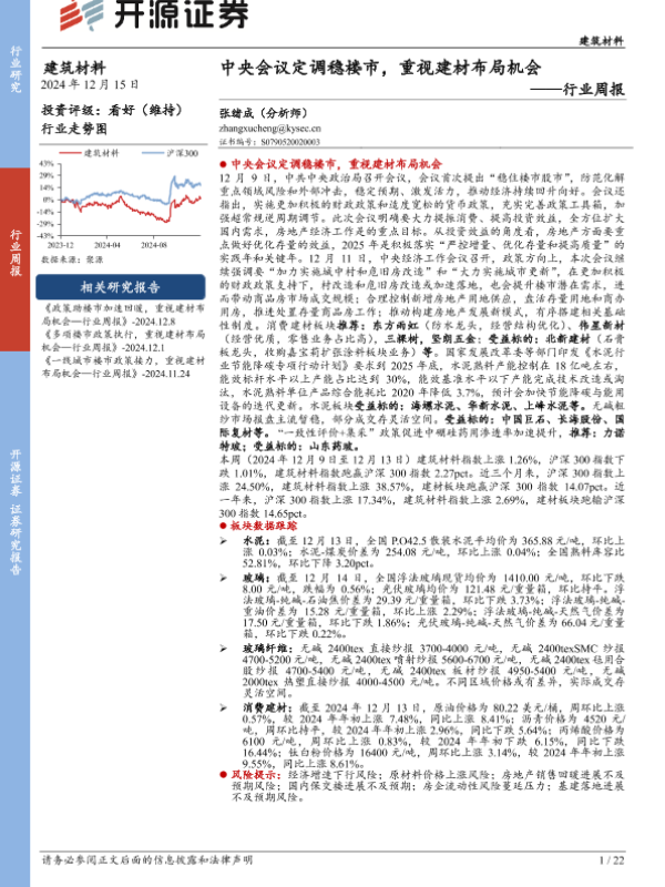 【开源证券】【20241219】2024年12月19日更新-【开源证券】建筑材料行业周报:中央会议定调稳楼市,重视建材布局机会-22页 行业研究