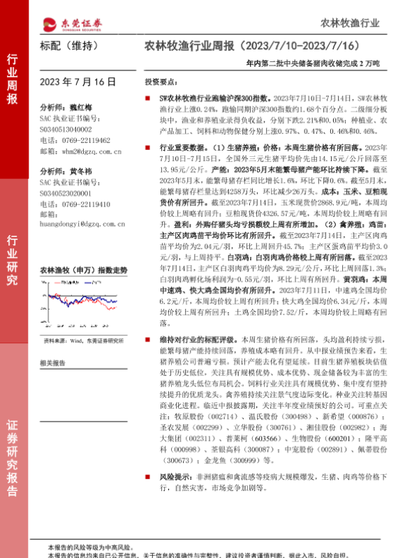 【东莞证券】【20230716】20230716-东莞证券-农林牧渔行业周报:年内第二批中央储备猪肉收储完成2万吨-12页 行业研究