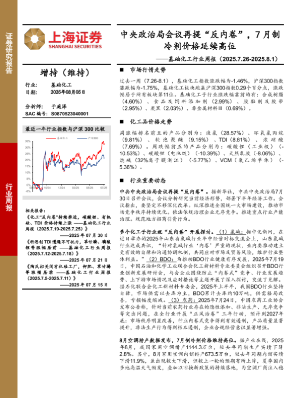 【上海证券】【20250805】基础化工行业周报:中央政治局会议再提“反内卷”,7月制冷剂价格延续高位-10页 证券期货研究报告