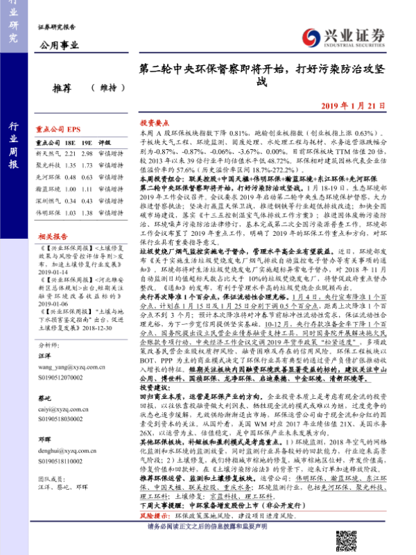【兴业证券】【20190121】第二轮中央环保督察即将开始,打好污染防治攻坚战-12页 行业研究