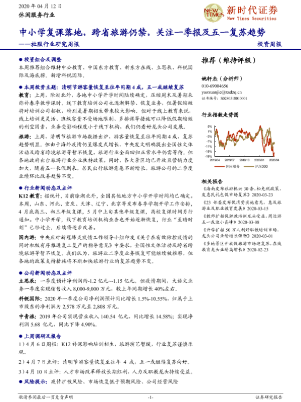 【新时代证券】【20200412】新时代证券-社服行业研究周报:中小学复课落地,跨省旅游仍禁,关注一季报及五一复苏趋势-18页 行业研究