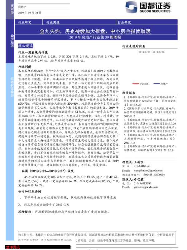 【国都证券】【20190930】2019年房地产行业第39周周报:金九失约,房企持续加大推盘,中小房企报团取暖-18页 行业研究