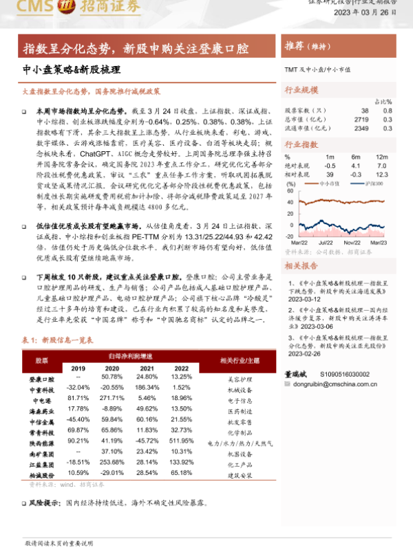 【海通证券】【20230326】中小盘策略&新股梳理:指数呈分化态势,新股申购关注登康口腔-22页 行业研究