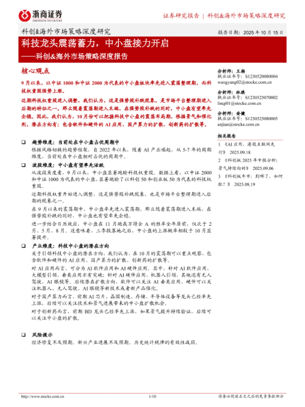 【浙商证券】【202510】科创&海外市场策略深度研究 报告日期:2025年 10月 15日 科技龙头震荡蓄力,中小盘接力开启-10页 证券期货研究报告