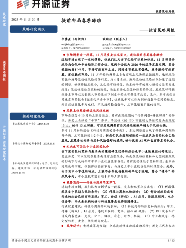 【开源证券】【202511】提前布局春季躁动——投资策略周报-13页 证券期货研究报告