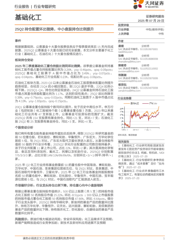【天风证券】【202507】基础化工行业专题研究:25Q2持仓配置环比微降,中小盘股持仓比例提升-17页 证券期货研究报告