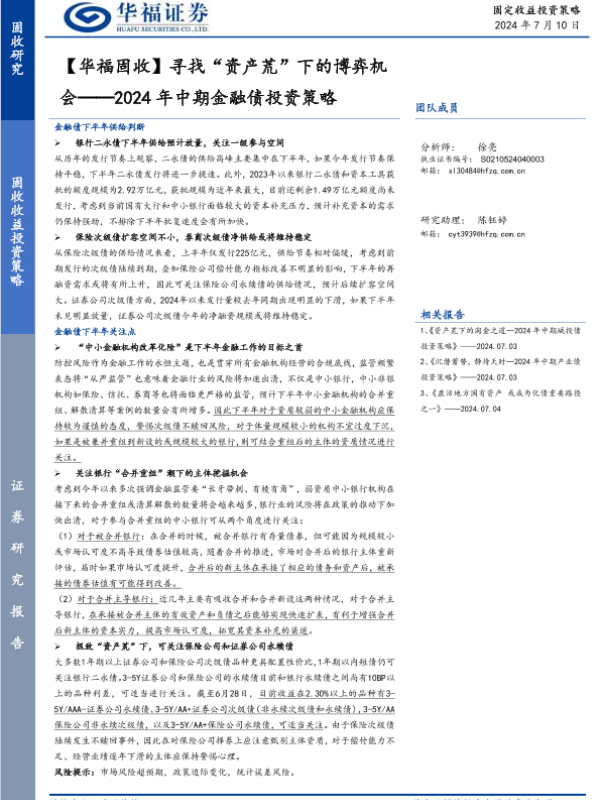 【华福证券】【20240710】2024年中期金融债投资策略:寻找“资产荒”下的博弈机会-16页 行业研究