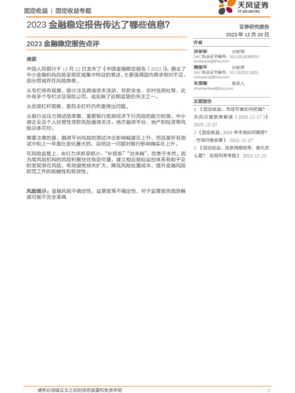【天风证券】【20231229】2023金融稳定报告点评:2023金融稳定报告传达了哪些信息?-12页 行业研究