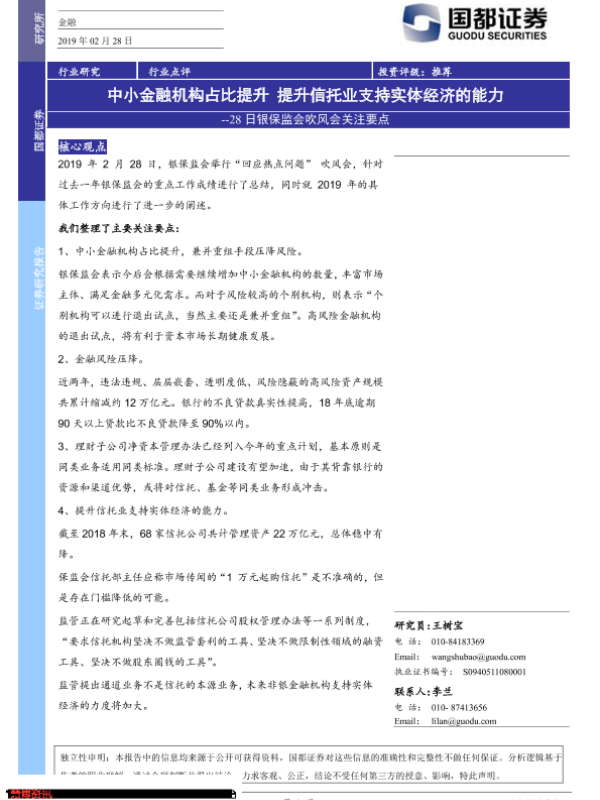 【国都证券】【20190228】28日银保监会吹风会关注要点:中小金融机构占比提升 提升信托业支持实体经济的能力-2页 行业研究