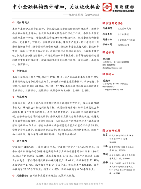 【川财证券】【20190303】银行业周报:中小金融机构预计增加,关注板块机会-12页 行业研究