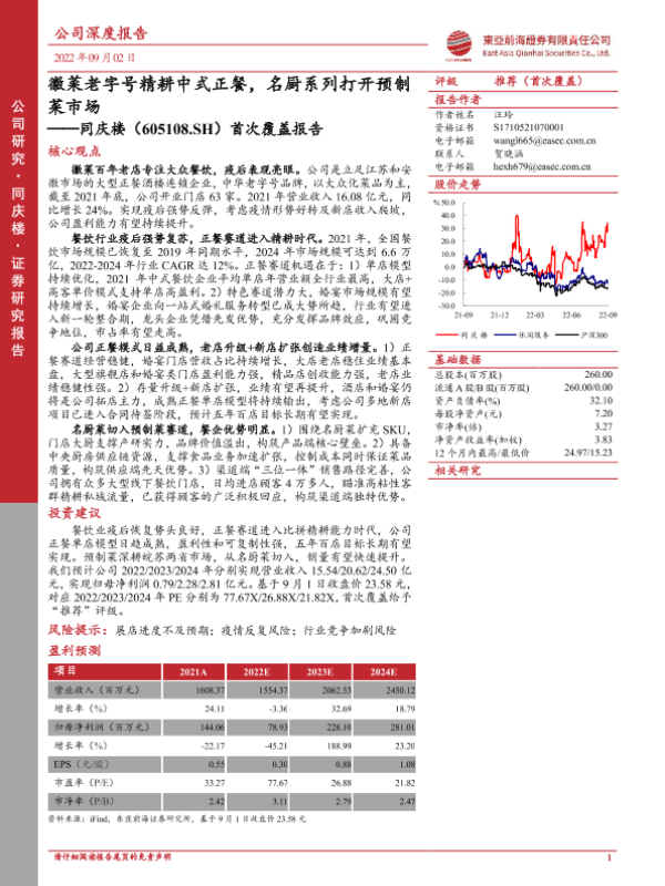 【东亚前海证券】【20220902】20220902-东亚前海证券-同庆楼-605108.SH-首次覆盖报告:徽菜老字号精耕中式正餐,名厨系列打开预制菜市场-32页 行业研究