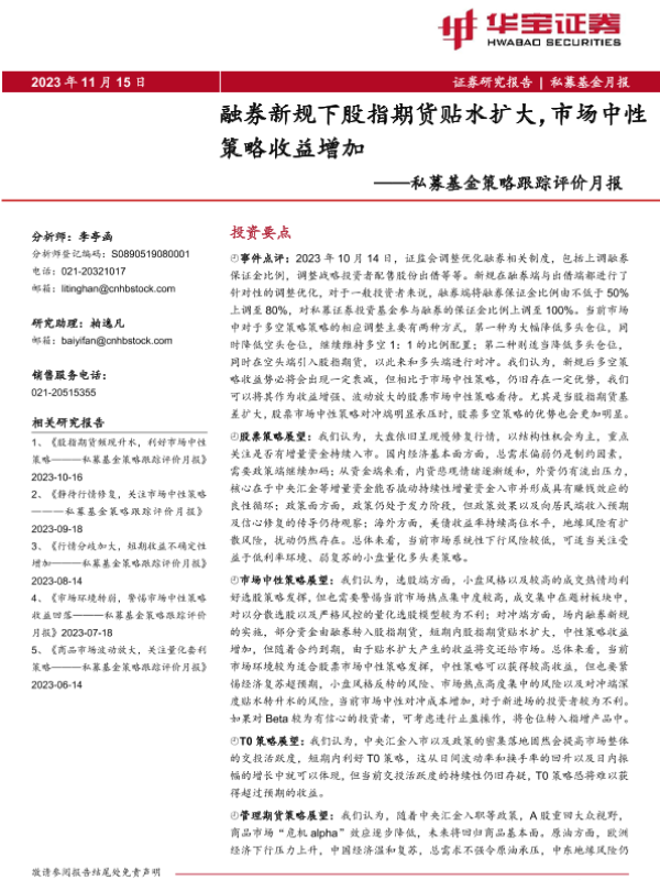 【华宝证券】【20231115】私募基金策略跟踪评价月报:融券新规下股指期货贴水扩大,市场中性策略收益增加-20页 行业研究