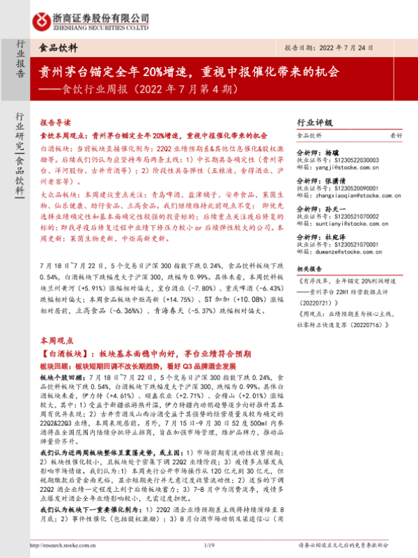 【浙商证券】【20220724】食饮行业周报(2022年7月第4期):贵州茅台锚定全年20%增速,重视中报催化带来的机会-19页 行业研究