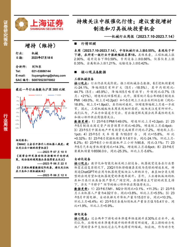 【上海证券】【20230718】20230718-上海证券-机械行业周报:持续关注中报催化行情;建议重视增材制造和刀具板块投资机会-23页 行业研究