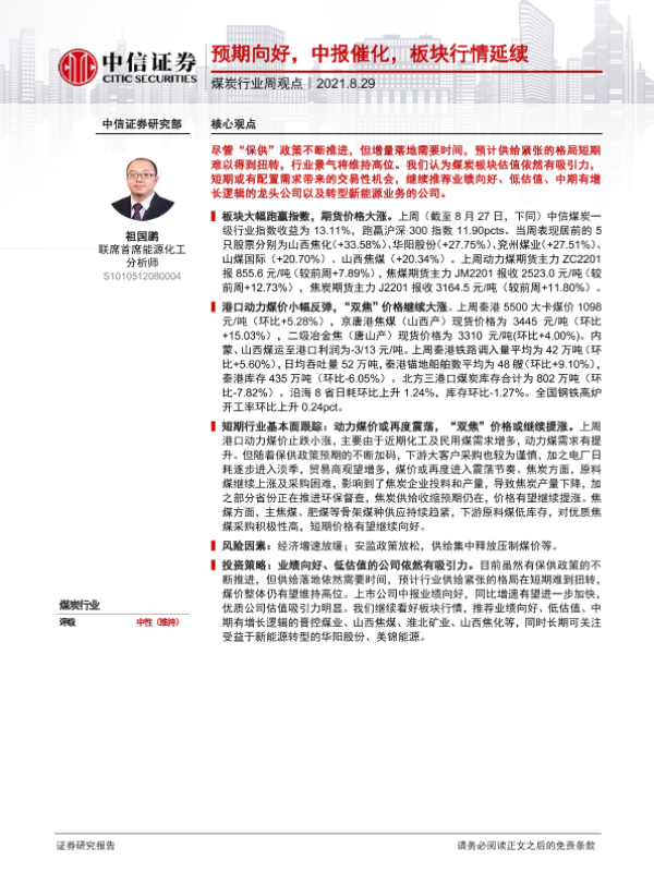 【中信证券】【20210829】20210829-中信证券-煤炭行业周观点:预期向好,中报催化,板块行情延续-7页 行业研究