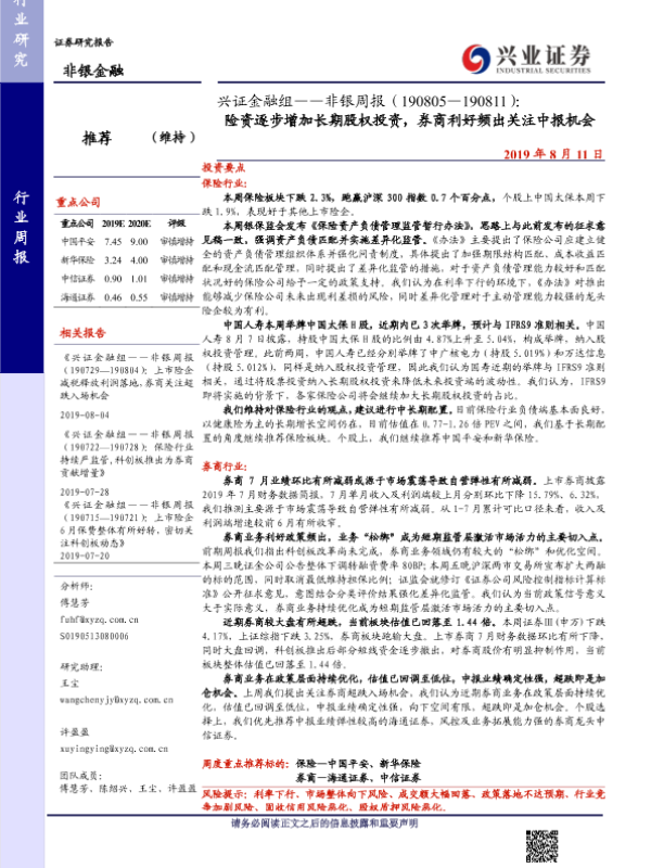 【兴业证券】【20190811】非银周报:险资逐步增加长期股权投资,券商利好频出关注中报机会-10页 行业研究